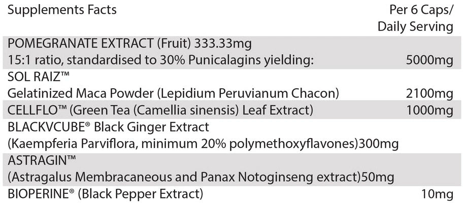 Sol Raiz™ Lepidium Peruvianum Chacon, CellFlo6™ green tea extract, Pomegranate extract and Blackvcube® Black Ginger extract were chosen because they each yield a multitude of clinically substantiated benefits which become even more pronounced when used in combination.